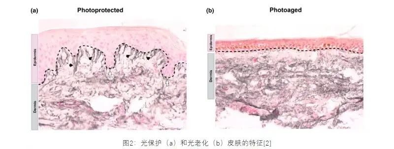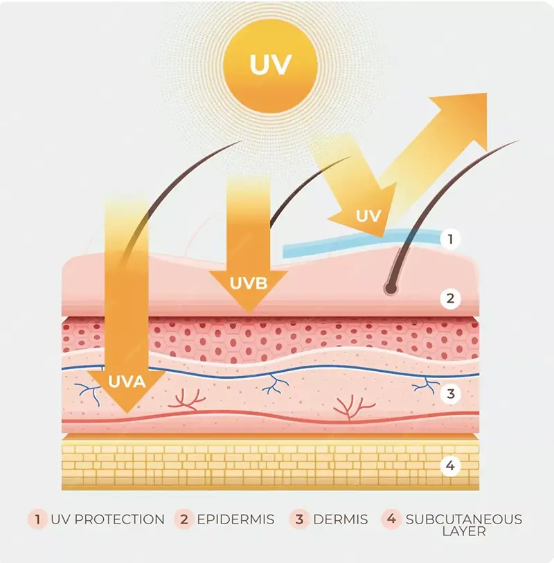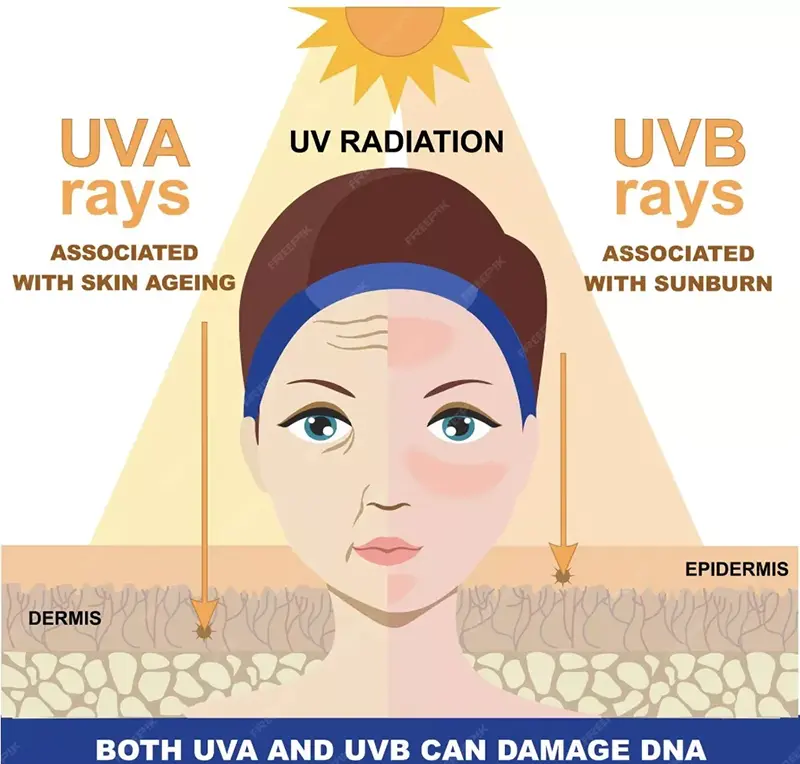 И УВА и УВБ можат да предизвикаат оштетување на кожата, но нивните ефекти се различни главно поради нивната длабочина на пенетрација. Очигледно побогатите UVA можат да навлезат подлабоко во дермисот и се подиректно поврзани со фотостареењето, бидејќи тие ќе произведуваат ROS и ќе го деградираат колагенот и еластинот, што ќе доведе до брчки, губење на еластичноста на кожата и други знаци на предвремено стареење. Спротивно на тоа, УВБ главно влијае на епидермисот, предизвикувајќи изгореници од сонце (соларна еритема) и производство на меланин на краток рок, додека долготрајната изложеност може да доведе до хиперкератоза и значително да го зголеми ризикот од малигни тумори на кожата.