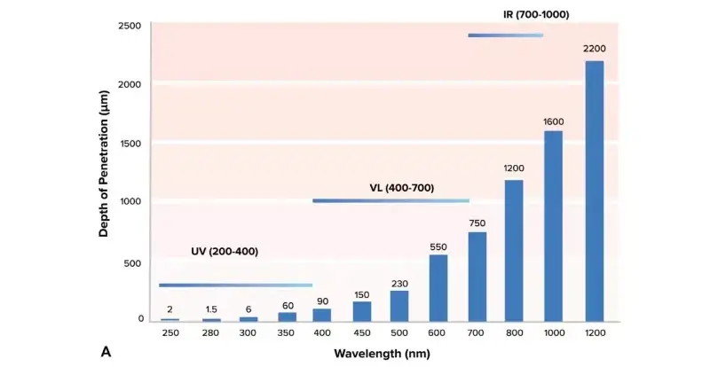 Како што е прикажано на горната слика, видливата светлина има големо влијание врз кожата, бидејќи оваа лента има подлабока длабочина на пенетрација во кожата. Црвената светлина може да навлезе во епидермисот и дермисот и да стигне до масниот слој, што укажува на врската помеѓу брановата должина и длабочината на пенетрација и обратната врска помеѓу брановата должина и енергијата, додека сината светлина има поголема енергија и помала длабочина на пенетрација од црвената светлина.