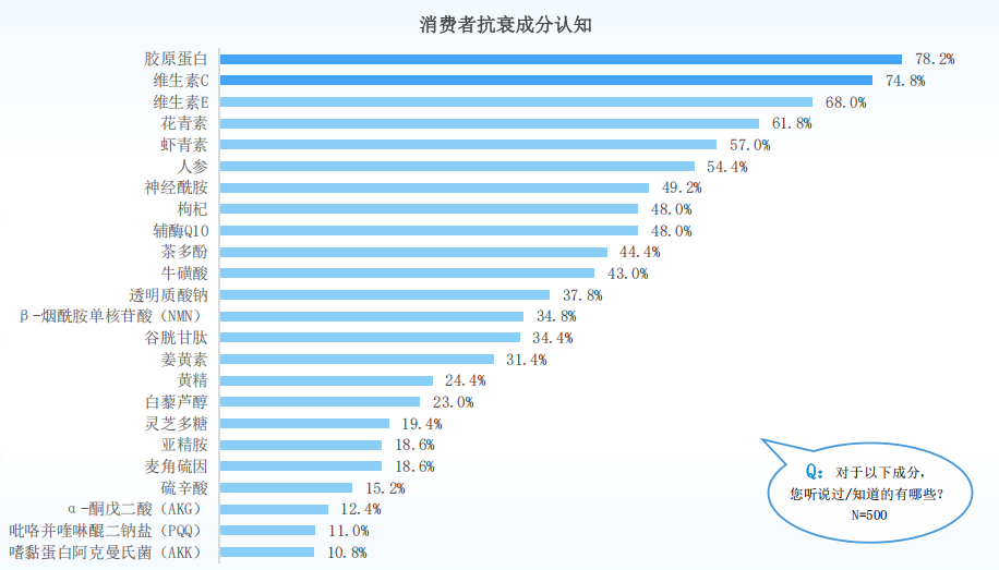 Благодарение на едукацијата и развојот на пазарот, колагенот во моментов е високо препознатлива „состојка против стареење“ меѓу потрошувачите. Во истражувањето за разбирање на главните состојки против стареење, колаген (78,2%), витамин Ц (74,8%) и витамин Е (68%) се првите три состојки кои потрошувачите ги препознаваат за оралните производи против стареење. Помеѓу првите 5 перцепции за состојките против стареење во различни возрасни групи, колагенот е несомнено „ѕвездената состојка“.